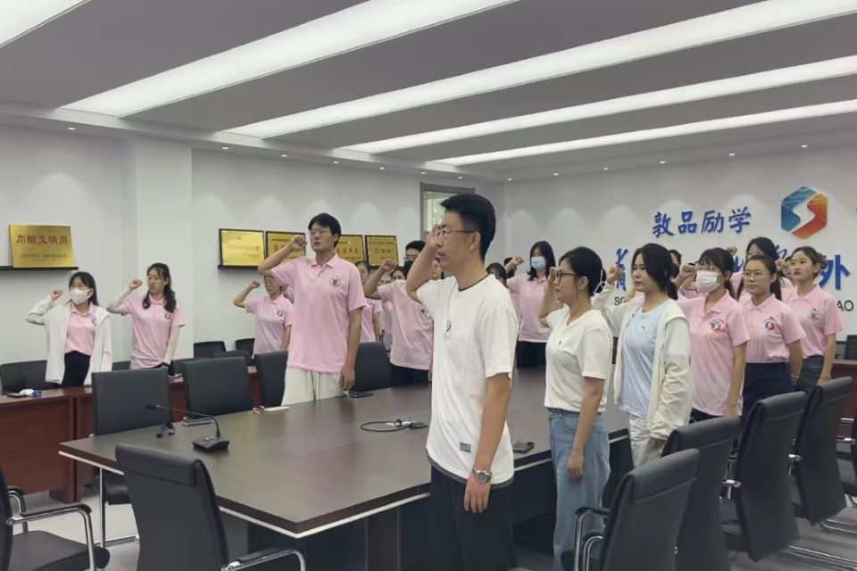 志愿服务队出发前,公司第三党支部书记线郁老师带领支部全体党员重温入党誓词,院员工会主席吴迪同学为领誓人。面对鲜红的党旗,支部党员举起右拳,再次庄严宣誓。口中说出的是誓言,拳头攥紧的是信念。铿锵有力的气势和蓬勃激昂的力量是师生党员向党致以青春的礼赞。