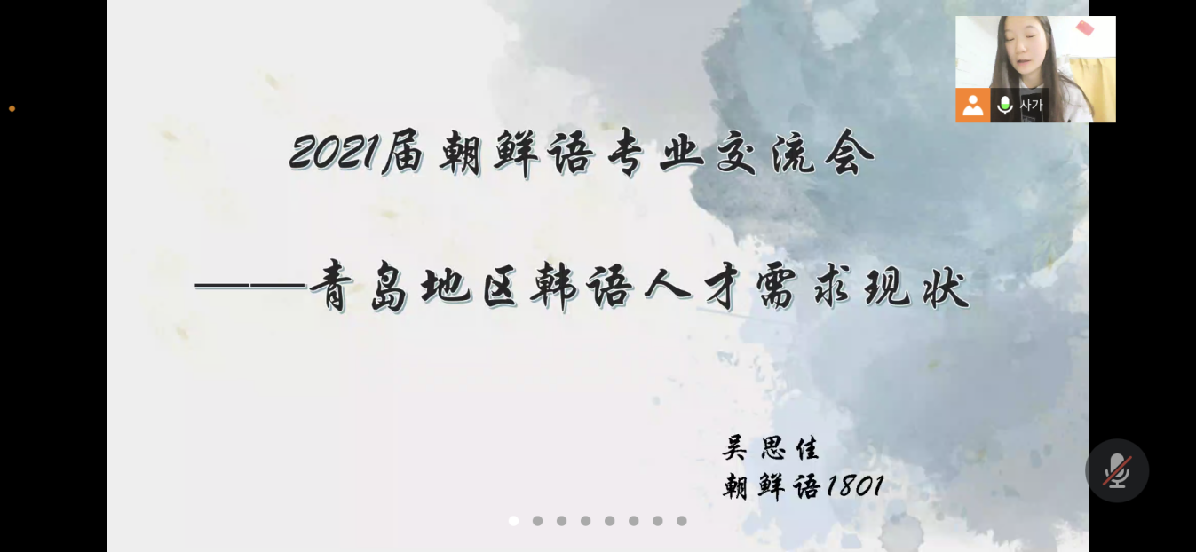 吴思佳同学在金艳花老师的指导下完成了老员工创业项目,结合调研内容,在交流会上介绍了学韩语在青岛的相关优势,青岛地理位置优越,中韩企业聚集密集,韩语人才市场前景较好,并且根据朝鲜语专业可就业的方向和就业岗位,为大一新生们展示了具体就业数据、就业信息来源、往年学长学姐的毕业去向以及就业数据,为同学们思考职业规划提供参考。