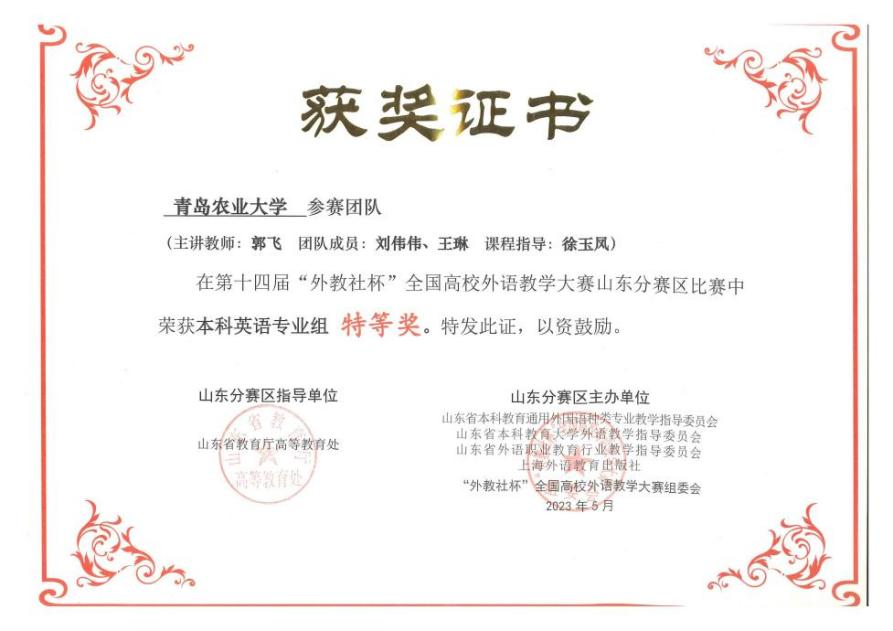 公司开展教学研讨和“教师工作坊”等活动,鼓励教师积极参加各类教学技能比赛,公司教学及人才培养工作成绩显著。近五年,公司荣获省级教学成果奖3项,青岛社科优秀成果奖、高校优秀科研成果奖15项。《大学英语》《中国农业文化概览》两门课程获批省一流本科课程。公司共36人次获得国家级、省级教学比赛奖项,其中郭飞团队荣获“外教社杯”全国高校外语教学大赛山东赛区特等奖,是公司教师参加此项比赛取得的最好成绩。38人获得校“青年教学能手”“最美教师”“最受欢迎本科任课教师”等荣誉称号。