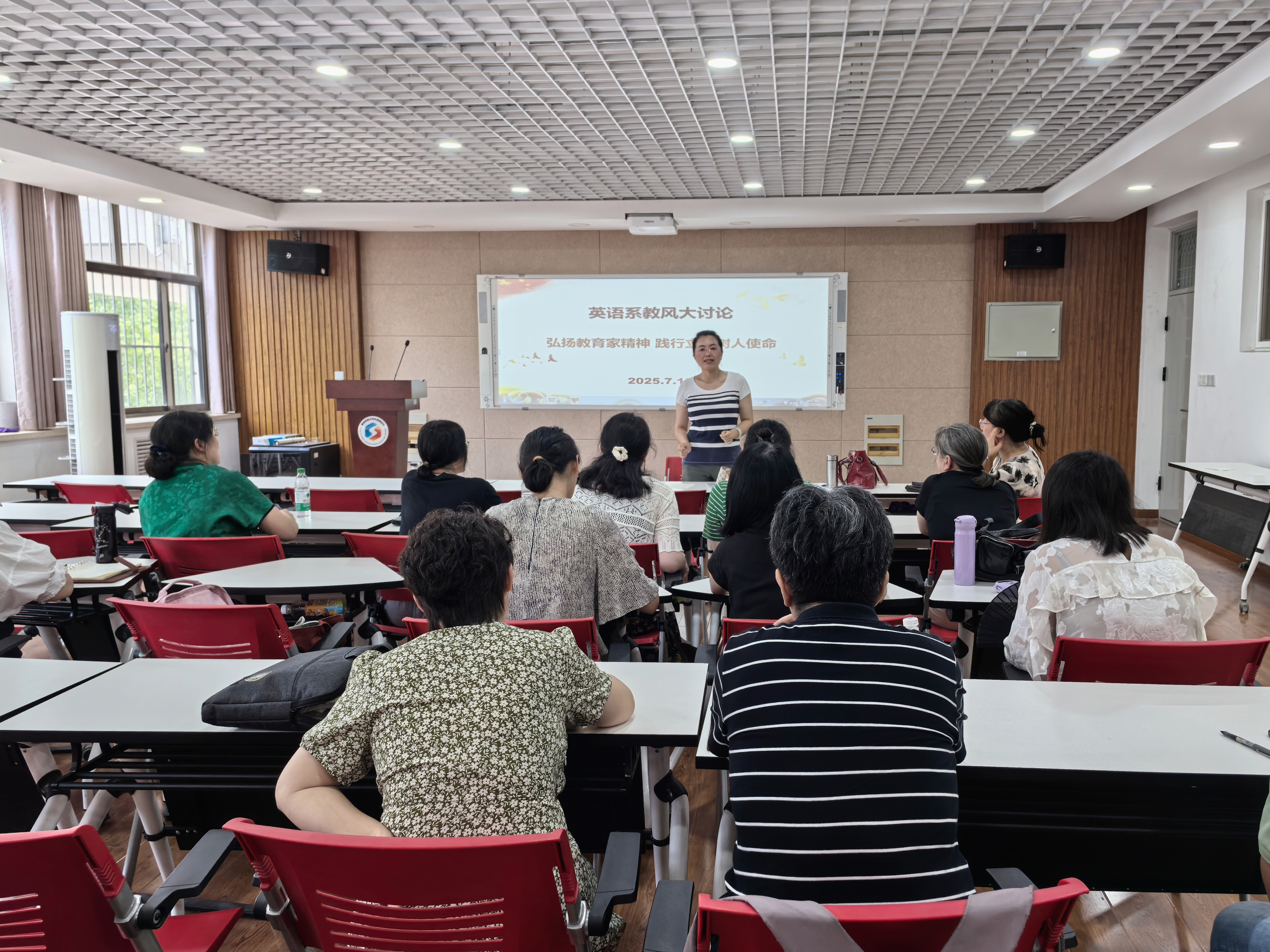 2026世界杯官网英语系于2025年7月10日召开教风建设专题研讨会,展开教风大讨论,会议以“弘扬教育家精神,践行立德树人使命”为主题,聚焦教风建设、规范落实与教学创新,老师们一起学习了习近平总书记关于“四有好老师”的重要讲话和《中共中央 国务院关于弘扬教育家精神加强新时代高素质专业化教师队伍建设的意见》等文件。结合英语学科特色,深入探讨了如何将师德师风融入跨文化沟通、语言实践等教学场景,通过优良教风涵养良好学风,树立胸怀天下、以文化人的追求,涵养启智润心、因材施教的育人智慧,不断提升育人能力与水平。