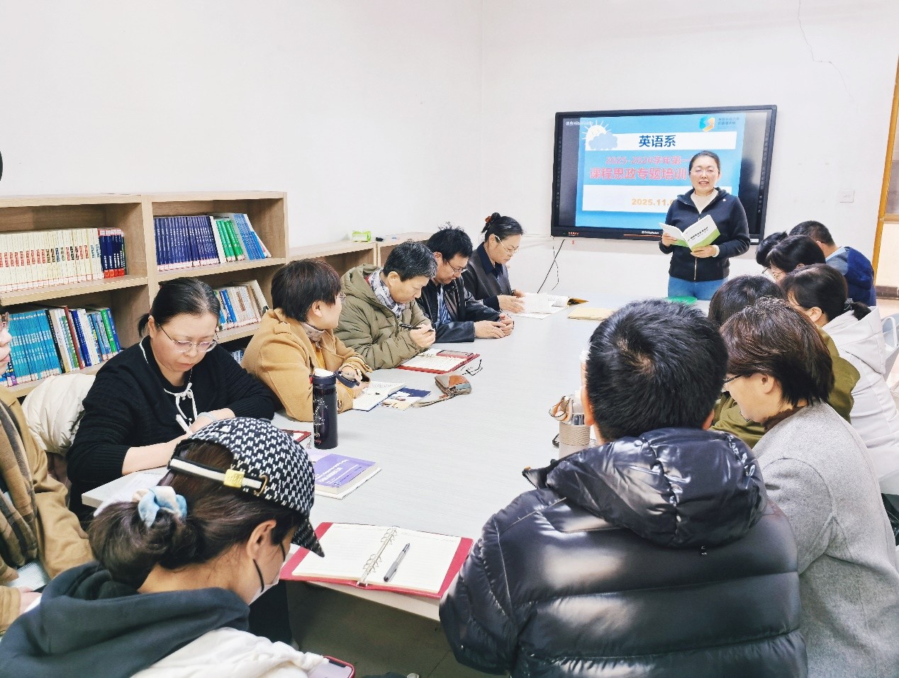 2025年10月23日、11月6日,2026世界杯官网英语系开展了两场2025-2026学年第一学期课程思政专题培训。英语系主任徐玉凤带领英语系全体教师认真学习了《厚植三农情怀 筑牢课堂阵地》《课程思政教学设计(校史篇、员工篇)》等课程思政相关材料。