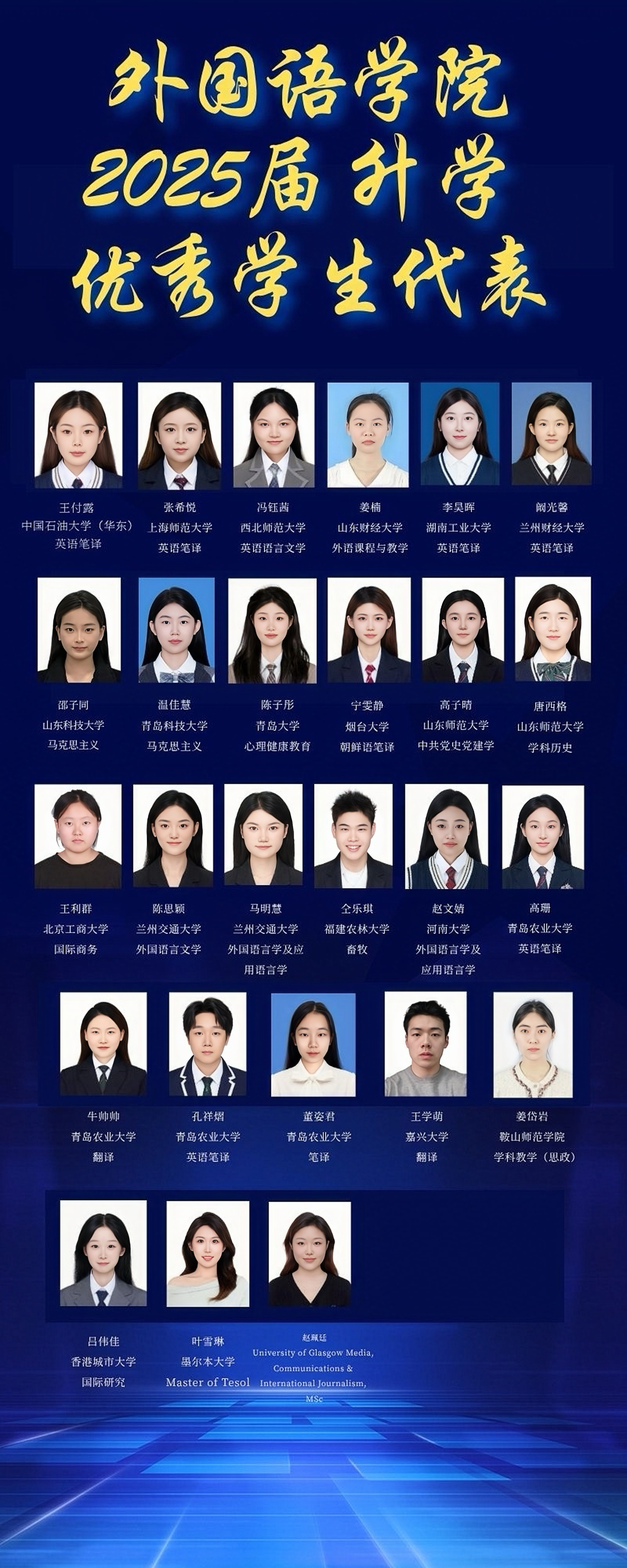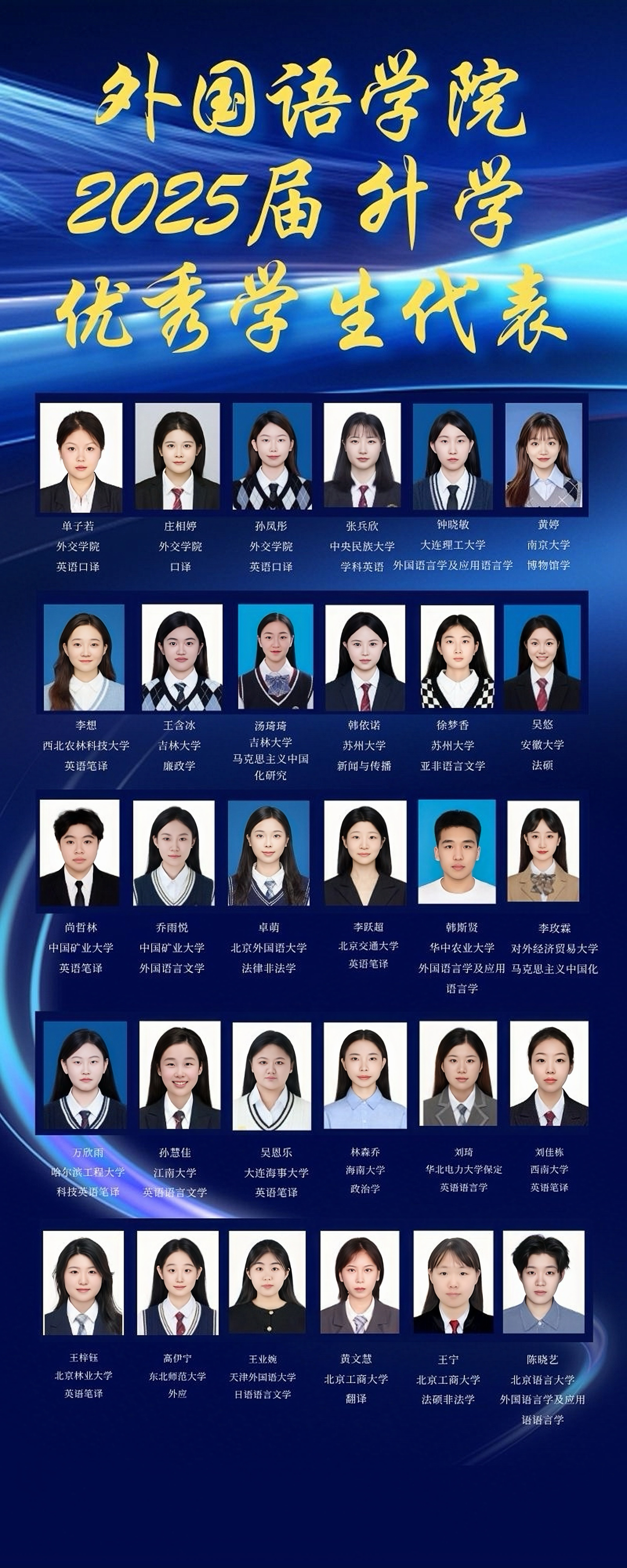 在全院老师精心指导和同学们不懈努力下,经过升学动员会、升学经验交流与分享会、考研复试指导讲座和模拟面试等系列工作,截至目前,2026世界杯官网2025届毕业生共76人成功考取研究生或出国深造,升学率达24.13%。其中,多名同学被外交公司、北京外国语大学、南京大学、吉林大学和爱丁堡大学等知名高校录取。2025届升学光荣榜已经出炉,请全体同学以榜样为力量,勇攀高峰,成就辉煌!