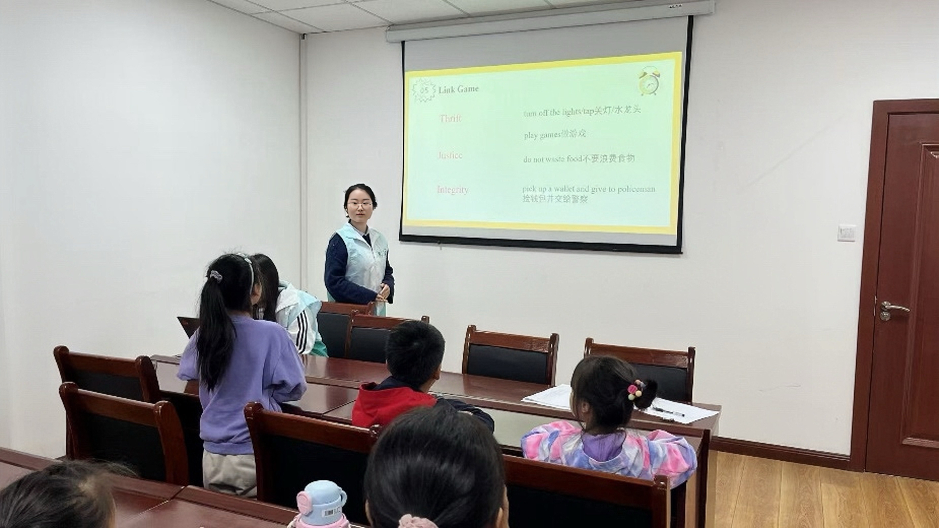本次活动以“廉洁教育”为主题,以一段生动有趣的动画导入课堂,通过活泼可爱的卡通形象和贴近小员工生活的情节,引导小朋友们对廉洁有了初步的认识。动画结束后,志愿者们巧妙地将廉洁教育与勤俭节约的行为相结合,教授了小朋友们日常生活中勤俭节约行为的相关英文表达,既增强了小朋友们对廉洁教育的理解,又提高了他们的环保意识。课堂的高潮部分是一系列互动游戏。志愿者们设计了中英文连线匹配的游戏环节,将廉洁教育和勤俭节约行为的中文描述与对应的英文单词进行连线。小朋友们热情高涨,纷纷举手抢答。