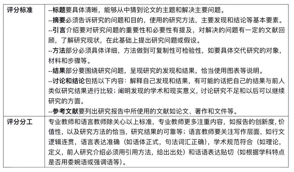 1.研究报告或研究计划(附件1)。演讲作品是基于一篇用英语撰写的研究报告或研究计划。研究报告包括标题、摘要、引言、方法、结果、讨论与结论、致谢和参考文献等基本部分。长度不少于 2000 英语单词。研究计划包括标题、摘要、研究目的、研究意义、文献回顾、研究问题、拟采用方法、预期结果、参考文献,长度在 1500 词左右。评分标准见表2.