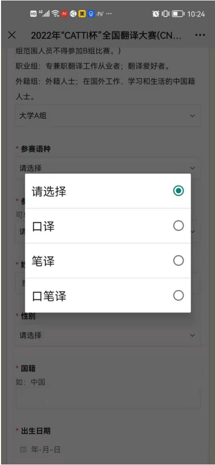 注意:根据语种选择相应比赛。韩国语同学和日语同学注意选择准确。其他同学选择“中英”。
