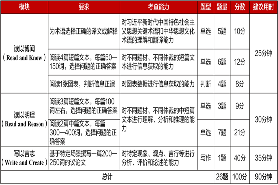 校园初赛于10月12日9:30—11:00在线举行,比赛地点另行通知。参赛选手登录大赛官网赛事系统参加比赛,考试时间为90分钟。全国统一线上初赛赛题由大赛组委会提供,包括客观题若干道和议论文写作1篇,赛题构成见下表,详见官网(https://ucc.fltrp.com/c/2025-05-12/530187.shtml)。