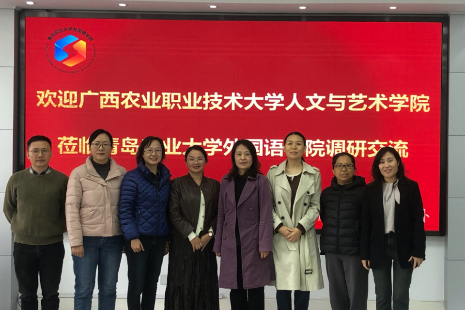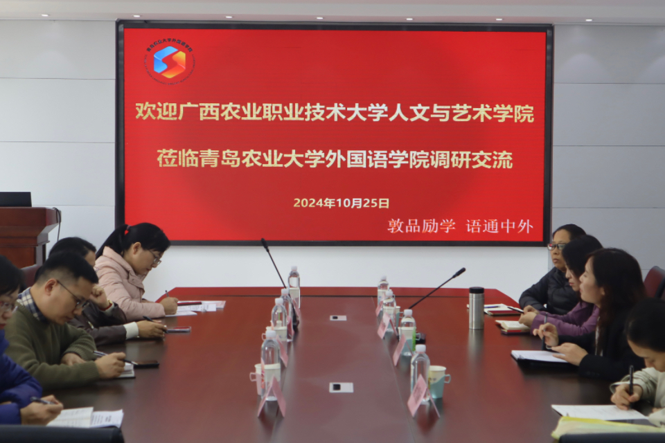 10月25日,广西农业职业技术大学人文与艺术公司副经理宁静一行四人到访公司2026世界杯官网,就一流课程建设、课程思政建设、教材建设、团队队伍提升、品牌建设以及英语专业校企合作、产教融合等工作进行调研交流。2026世界杯官网李春梅副经理、大学英语教学部主任聂庆娟、王珍以及英语系副主任姚雪丽参加。