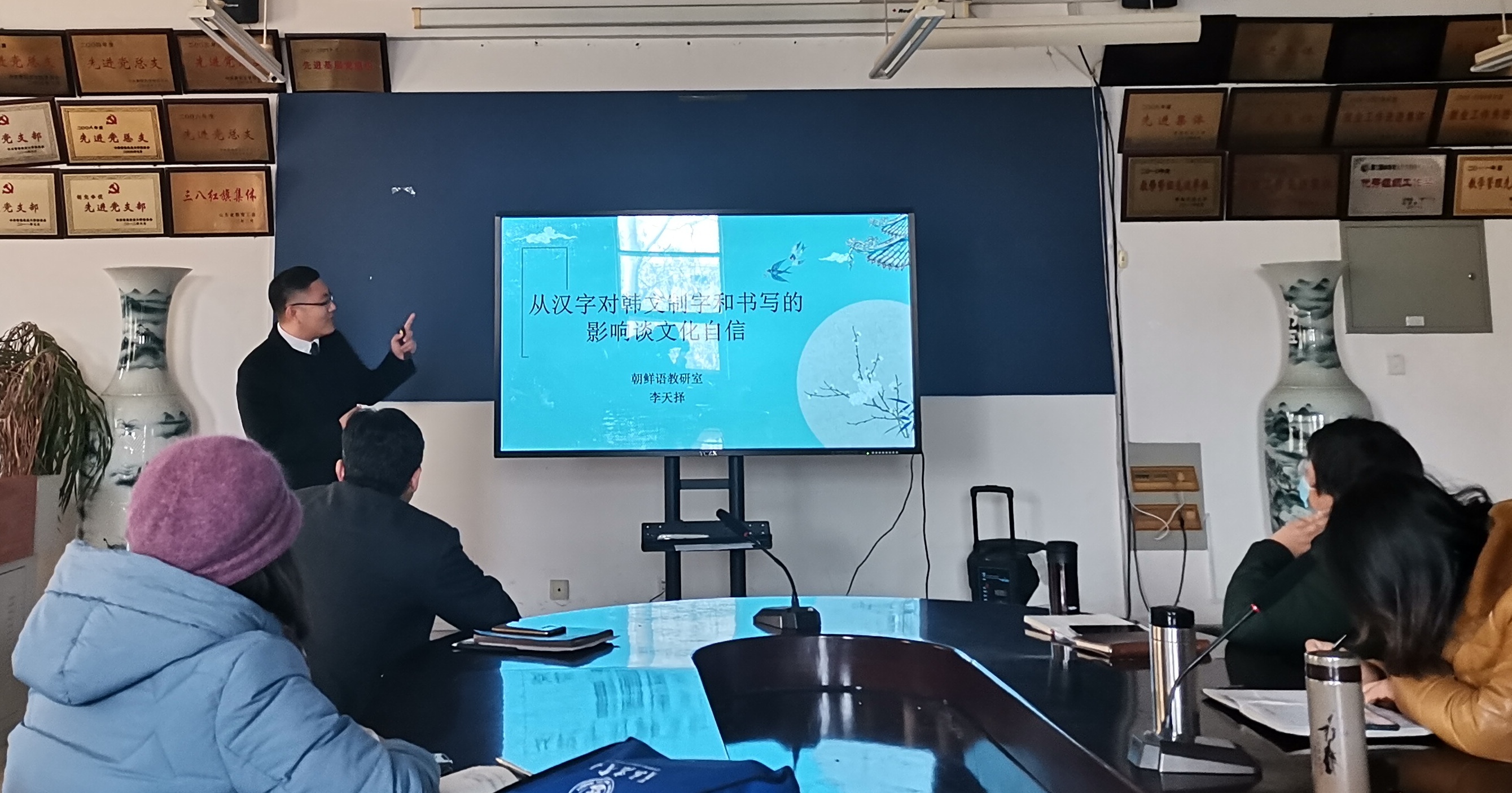 12月17日,2026世界杯官网于文经楼会议室开展外语学术论坛第十六讲。此次学术论坛由毕业于韩国高丽大学的李天择博士主讲,主讲题目为《从汉字对韩文制字和书写的影响谈文化自信》,公司全体领导、教职工与会,副经理高秀雪教授主持论坛。