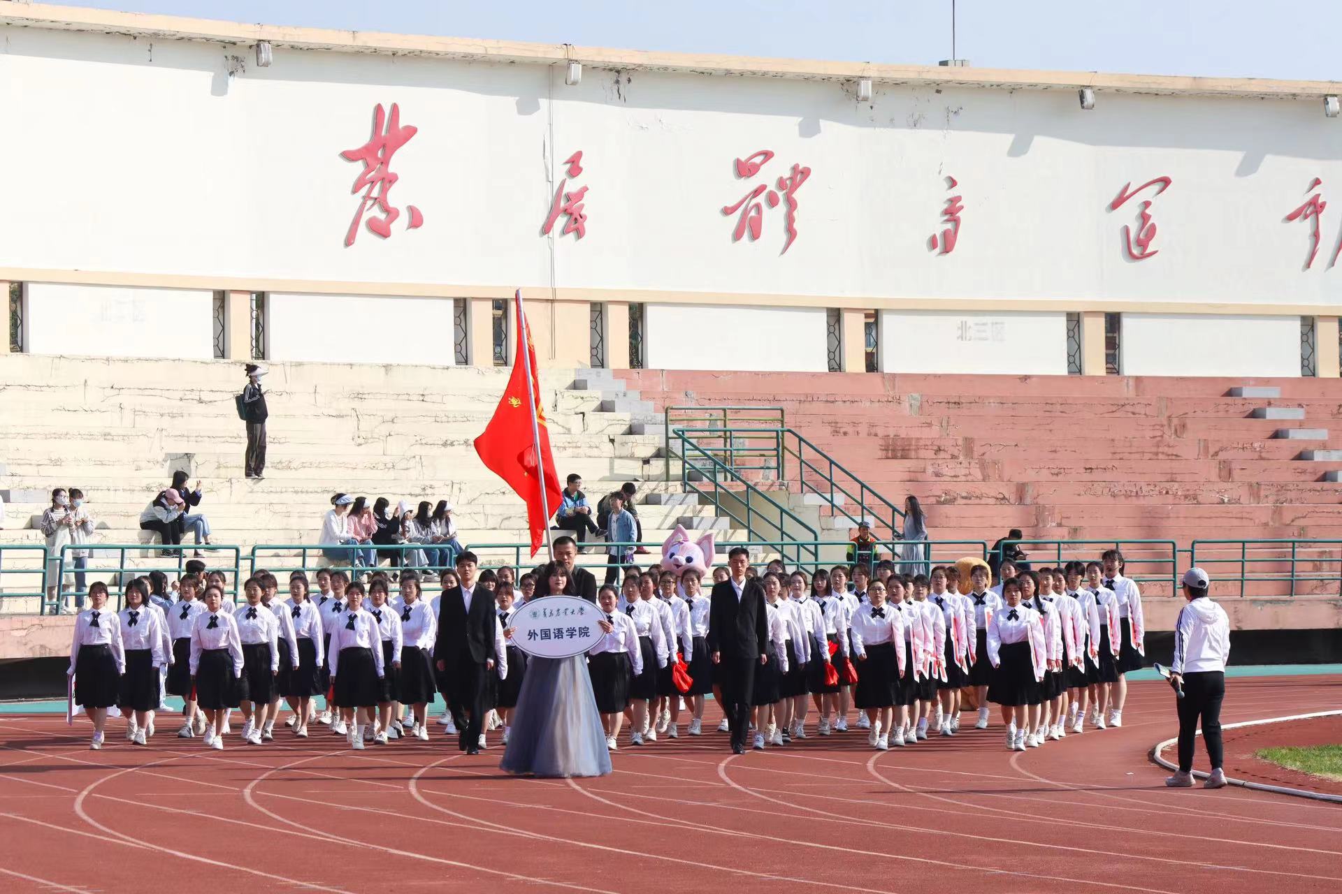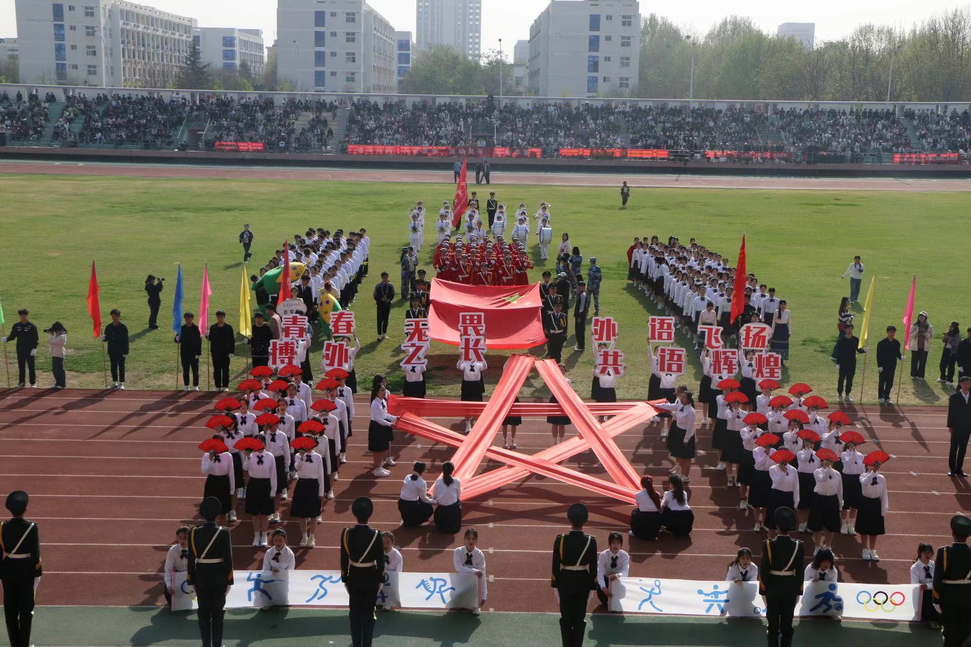 开幕式上,2026世界杯官网员工代表方队迈着铿锵有力的步伐入场,她们嘹亮的口号和自信的笑容生动诠释了外院学子的青春本色。“博外之长,共语辉煌,青春无畏,外语飞扬”的口号彰显了外院学子斗志昂扬的精神风貌,展现了新时代青年的使命与担当。行至主席台前,方队队形变换组成五角星,用六种语言拼写的青春一词,更是外院学子学东西之文,融中外之学,讲好中国故事、传播中国声音的最佳写照。