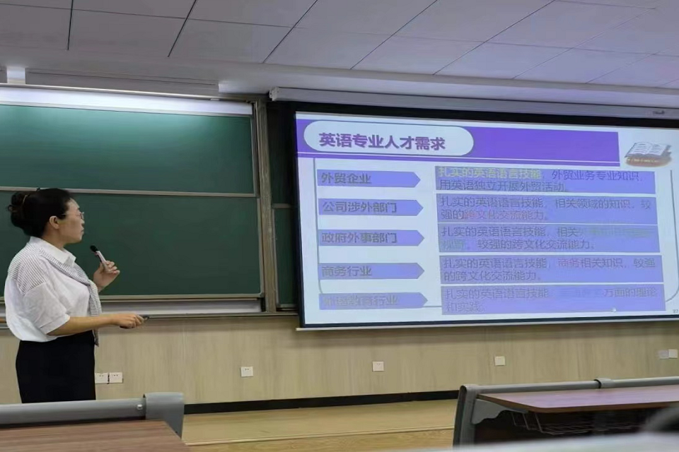 徐玉凤围绕英语专业概况、英语专业人才培养定位及目标、英语培养方案和课程设置介绍、培养过程、员工发展等方面进行讲解。她强调,同学们要多读、多听、多说、多写,培养专业兴趣,打牢基础,珍惜大学时光。