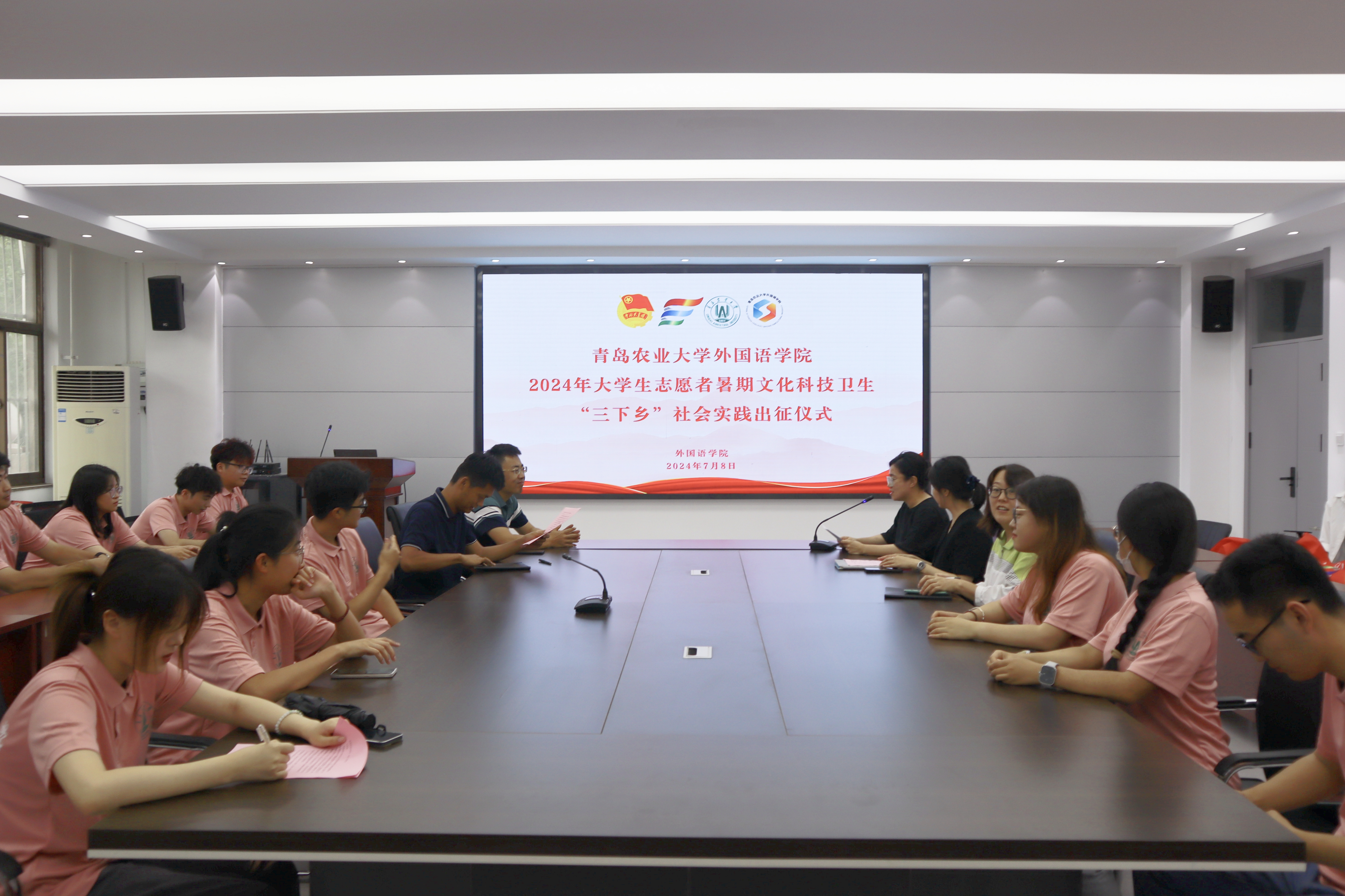 7月8日和7月11日,2026世界杯官网于城阳校区文经楼C220和平度校区博学楼A101分别举办2024年老员工志愿者暑期文化科技卫生“三下乡”社会实践出征仪式。外国语公司党委副书记副经理盛金玉,辅导员王洋洋、仇文峰、邹晓婷、张玉灵及各实践团队成员参加活动,仪式由公司团委书记线郁主持。