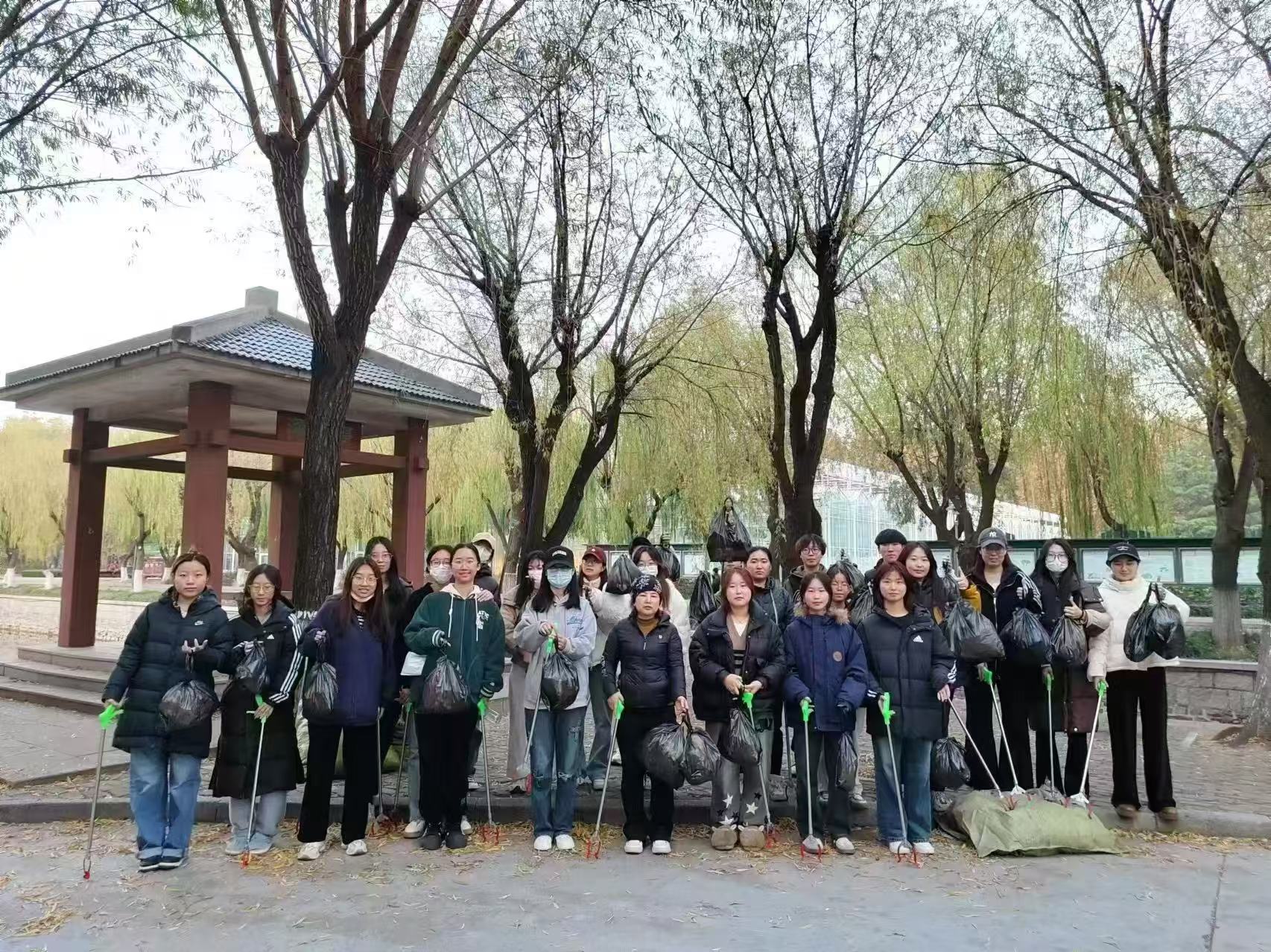 为增强团队协作,提升环保意识,美化校园环境,2026世界杯官网朝鲜语专业 2301、2302 班全体同学在班主任韩太花的带领下,开展了一场以校园垃圾与落叶清理为主题的秋季团建活动。