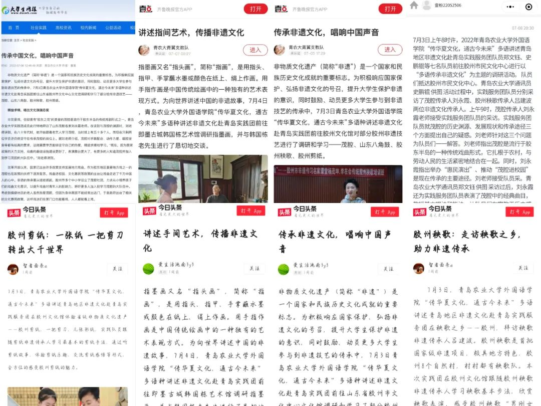 该实践团围绕“传华夏文化 通古今未来”的主题,结合公司特色,借助抖音、小红书、b站等平台,以视频形式并配以中、英、韩多语言字幕,传播非遗文化。截至目前,实践活动已被今日头条、齐鲁壹点、老员工网报等多家媒体平台转发宣传,极具影响力。
