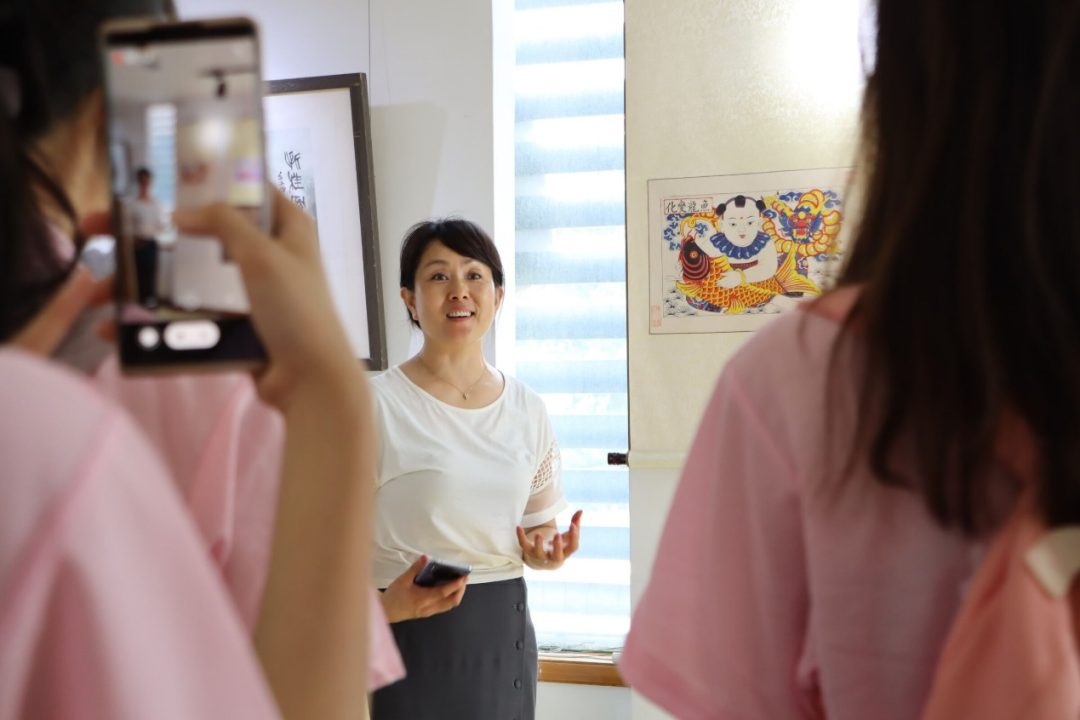 第一站,潍坊木版年画博物馆。时光知味,岁月沉香。7月9日下午,成员们受到潍坊中恒杨家埠木版年画博物馆馆长赵立萍的热烈欢迎,并在赵馆长的带领下,品味一幅幅年画作品,体会历史沉淀的韵味。求木之长者,必固其根本,欲流之远者,必浚其泉源。在观赏中,实践团队也进一步了解了木版年画的由来、发展历程、制作工艺等,深刻理解了“木版年画是民俗文化的一面镜子”的含义。赵馆长感叹道:“我很开心你们这些年轻人愿意来参观杨家埠木版年画,把这些中国优秀的传统文化宣传出去,非遗传承需要你们这些新鲜血液。”