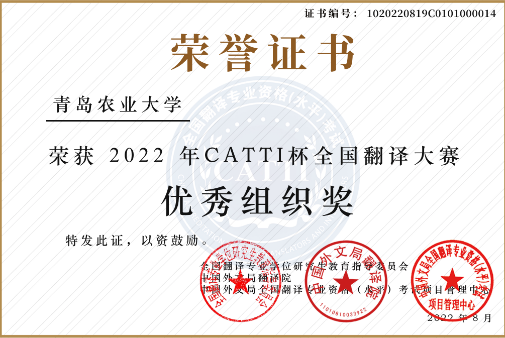近日,2022年“CATTI杯”全国翻译大赛(决赛)结果揭晓,公司外院学子喜获佳绩。杨菲菲(英语跨境电商1901)获得大学A组笔译一等奖,高玉丽(英语1904)、王岩(英语跨境电商2002)获得二等奖,王琪(英语1904)获得三等奖。在省级复赛中,公司学子有12人次在大学A组中英笔译、口译比赛中获奖,其中特等奖2人,一等奖1人,二等奖5人,三等奖4人。世界杯2026官方网站荣获2022年CATTI杯全国翻译大赛优秀组织奖。