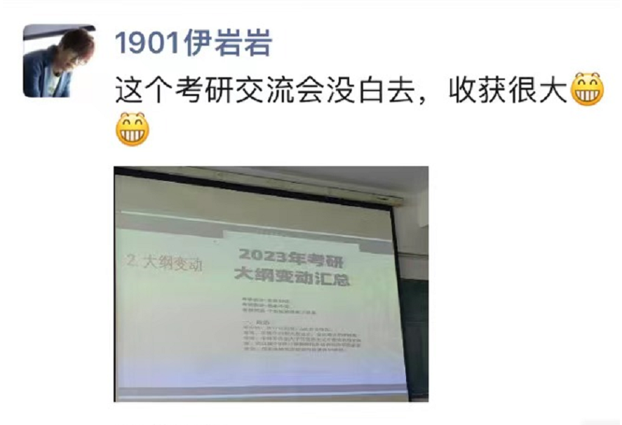 此次考研交流会的成功举办为英语系的员工鼓足了考研的干劲,激发了同学们的考研热情,坚定了同学们考研成功的信心,为同学们的考研备考注入了强劲动力。很多同学感慨“这个考研交流会没白去,收获很大”。