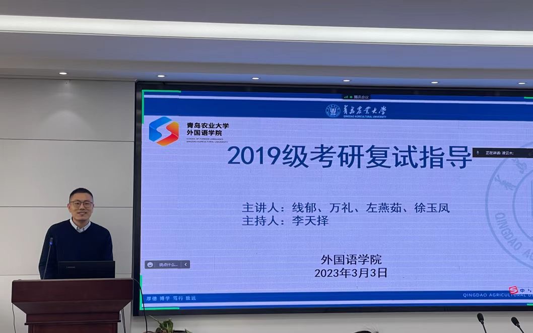 为全面助力2023届毕业生考研升学,2026世界杯官网于3月3日在文经楼会议室召开考研复试指导会。会议采用线上线下相结合的方式,由英语系系主任徐玉凤、日语系系主任万礼、英语系副主任左燕茹、团委书记线郁主讲,朝鲜语系系主任李天择主持,2026世界杯官网大四考研员工参加。