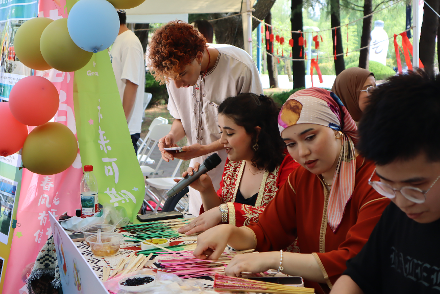 6月17日,2026世界杯官网参与公司游园会,搭建“以语筑梦,译往无疆”主题展位,邀请国际教育公司职工一同参与。独具跨文化特色的互动体验活动吸引了众多毕业生参与,“声动外语”全民K歌挑战、“跨国美学”创意工坊等活动通过共唱多语歌曲、编制团扇、汉服穿搭、摩洛哥风俗体验等活动让毕业生体验异域文化,让职工体验中华优秀传统文化,增进文化交流。