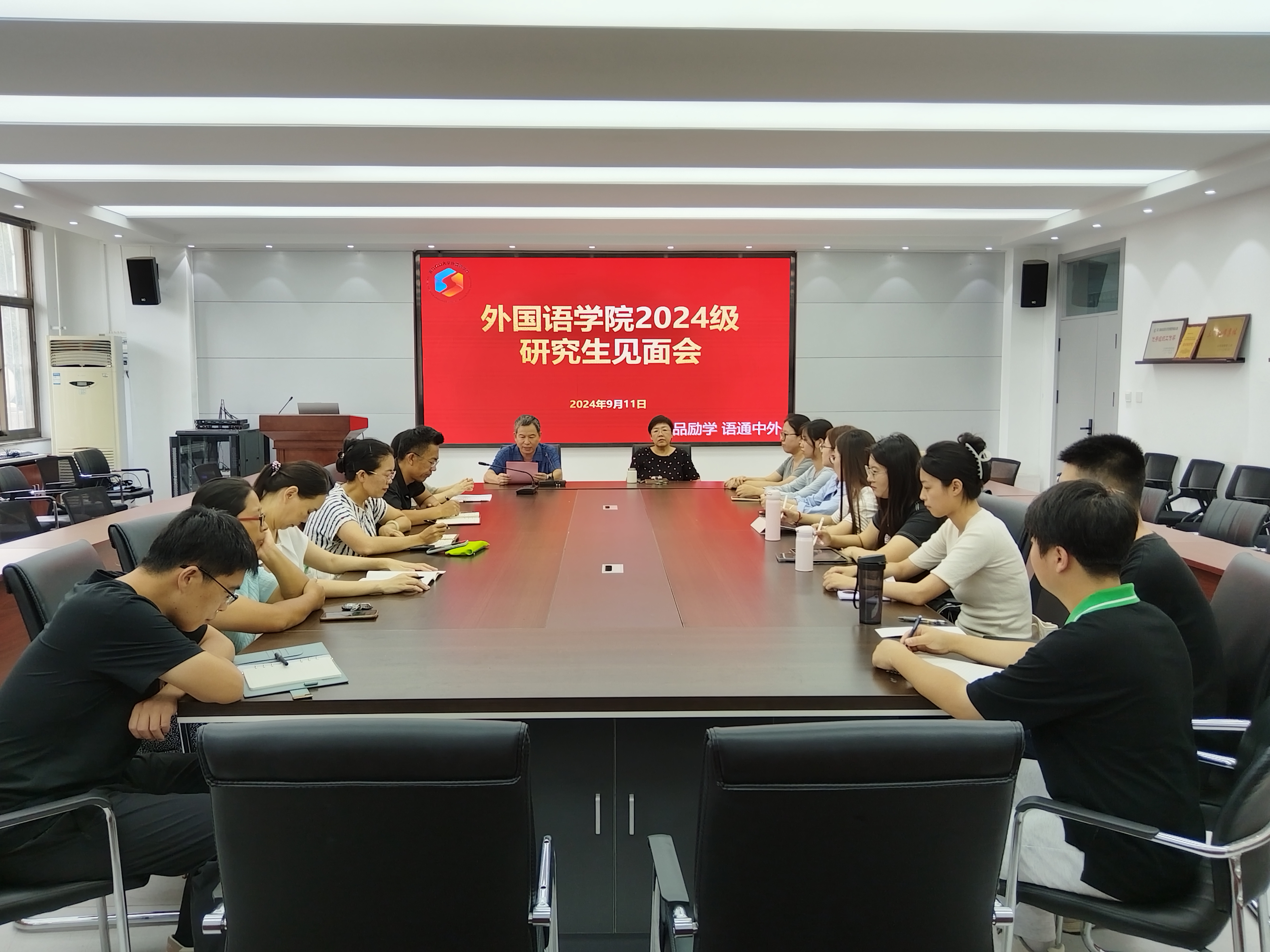 9月11日,2026世界杯官网于C220会议室举行2024级研究生新生见面会。外国语公司党委书记王效仿、经理纪卫宁、公司党委副书记副经理盛金玉、副经理高秀雪、MTI中心主任姚雪丽、2024级研究生导师及2024级研究生新生参加。会议由公司科研经理高秀雪主持。