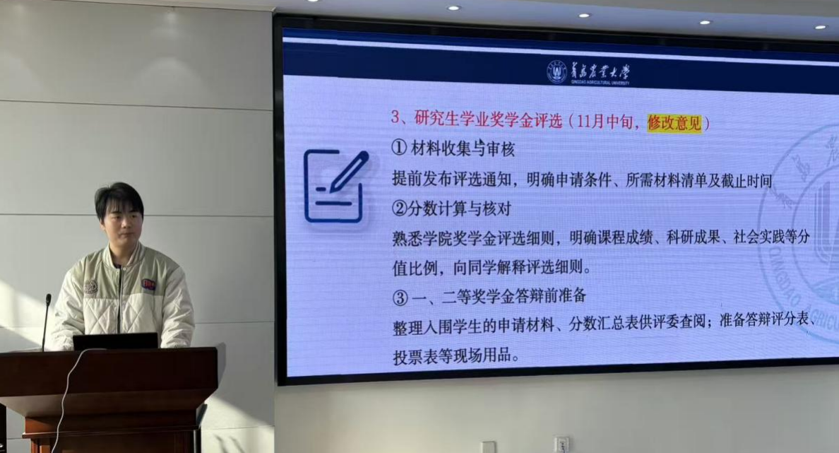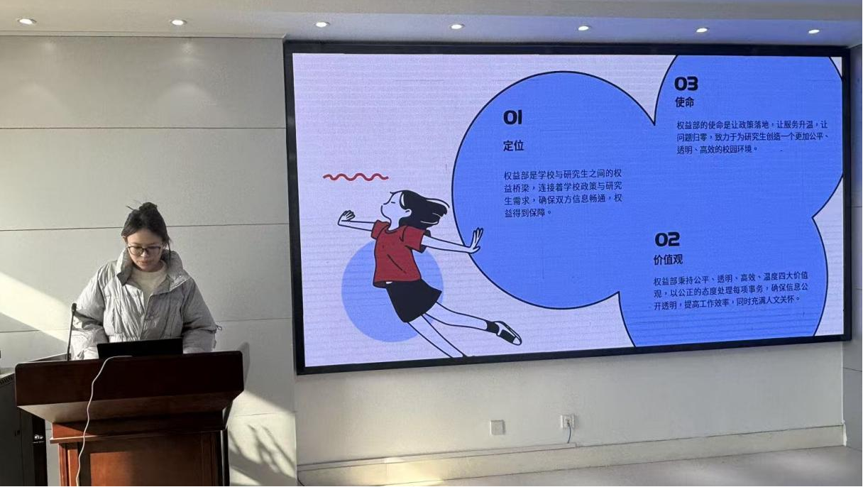 会上,各部门部长围绕职责分工和重点工作进行交流发言,对部门任务和工作要求作出说明。学术部、宣传部、权益部及实践与乡村振兴部结合实际,分别就学科竞赛与学术活动、新闻宣传与新媒体建设、员工权益保障以及社会实践组织等方面进行了介绍,进一步明确了工作重点。张一岳对本次培训会进行总结。她表示,各部门要强化沟通协作,压实工作责任,以务实高效的工作作风推动研究生会各项工作有序开展。