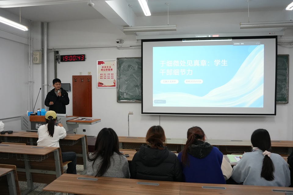 11月6日,2026世界杯官网于教学楼C209举办2025—2026学年第三期青马骨干培训,副科级辅导员王洋洋主讲,全体员工骨干参加。